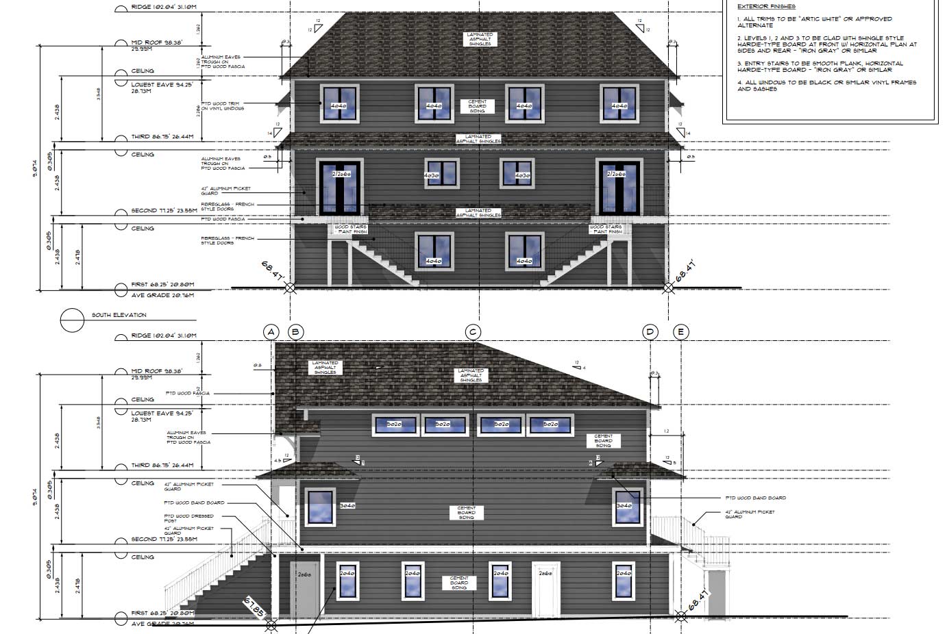 2. Levels 1, 2 and 3 to be clad with shingle style hardie-type board at front w/ horizontal plan at sides and rear – “Iron Gray” or Similar